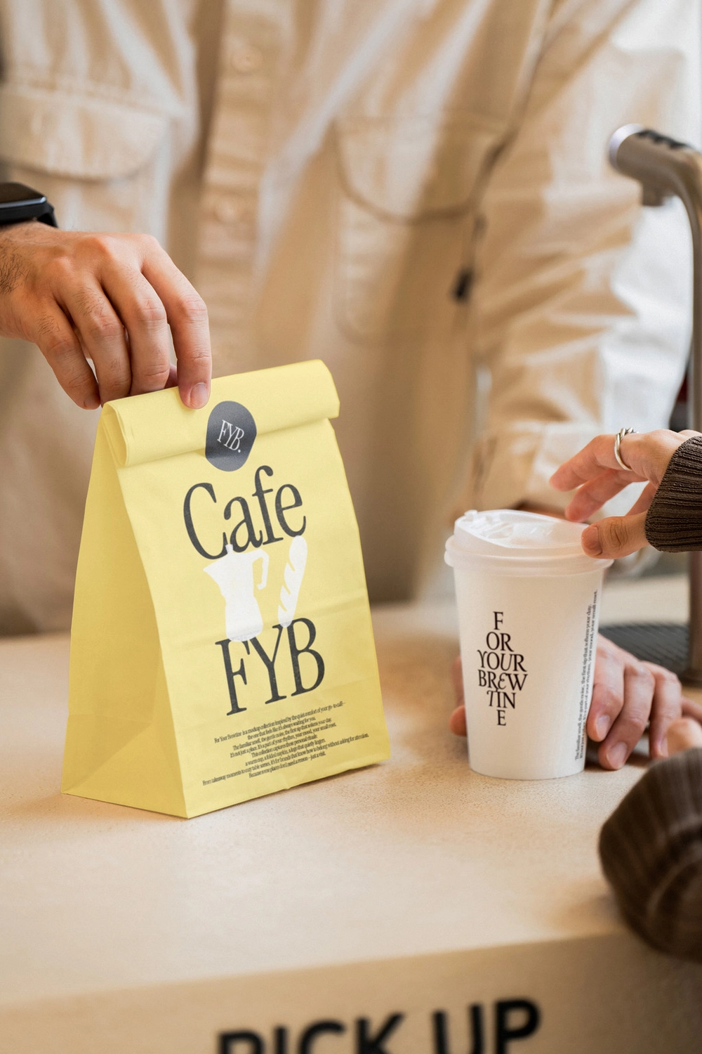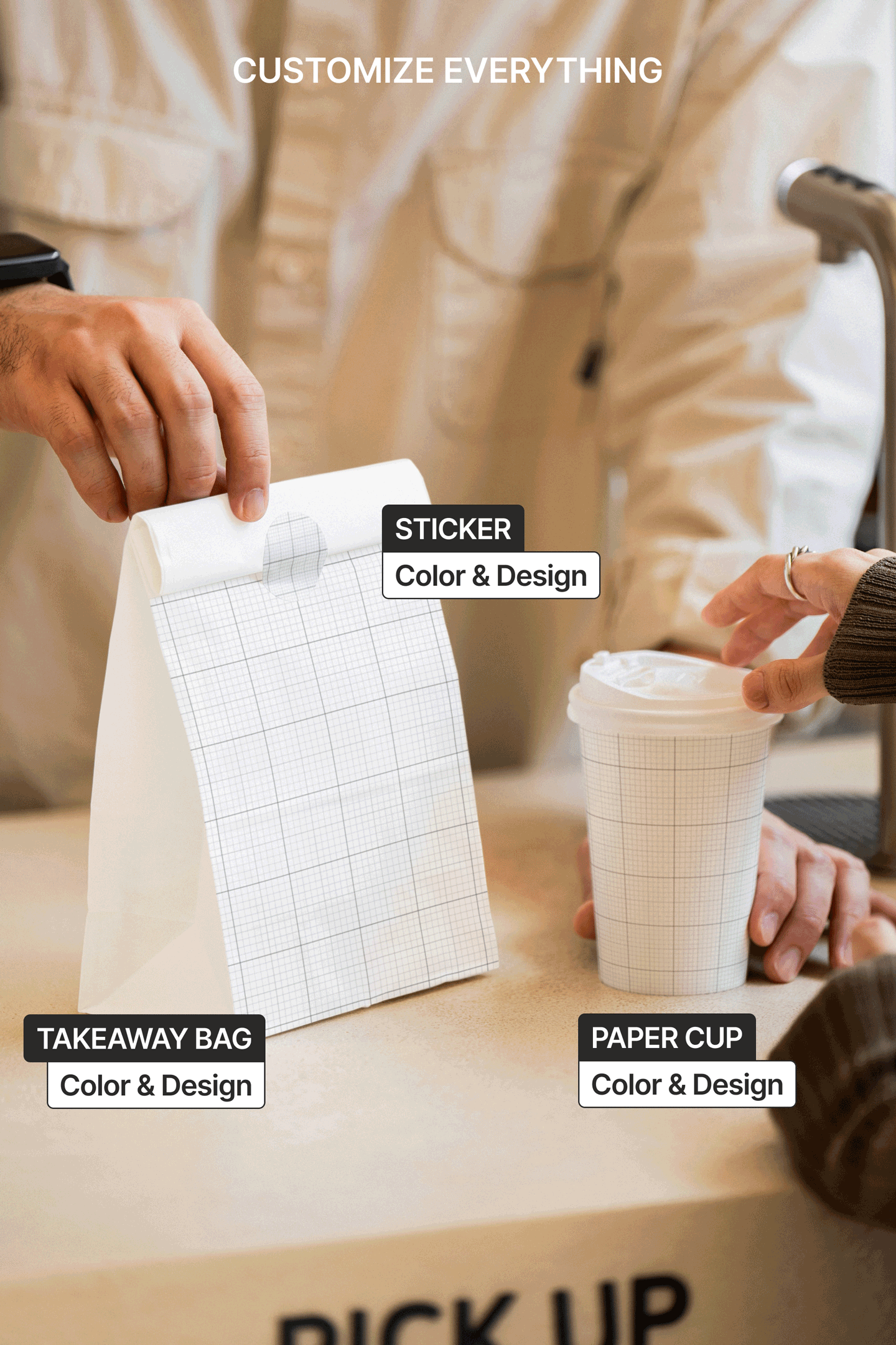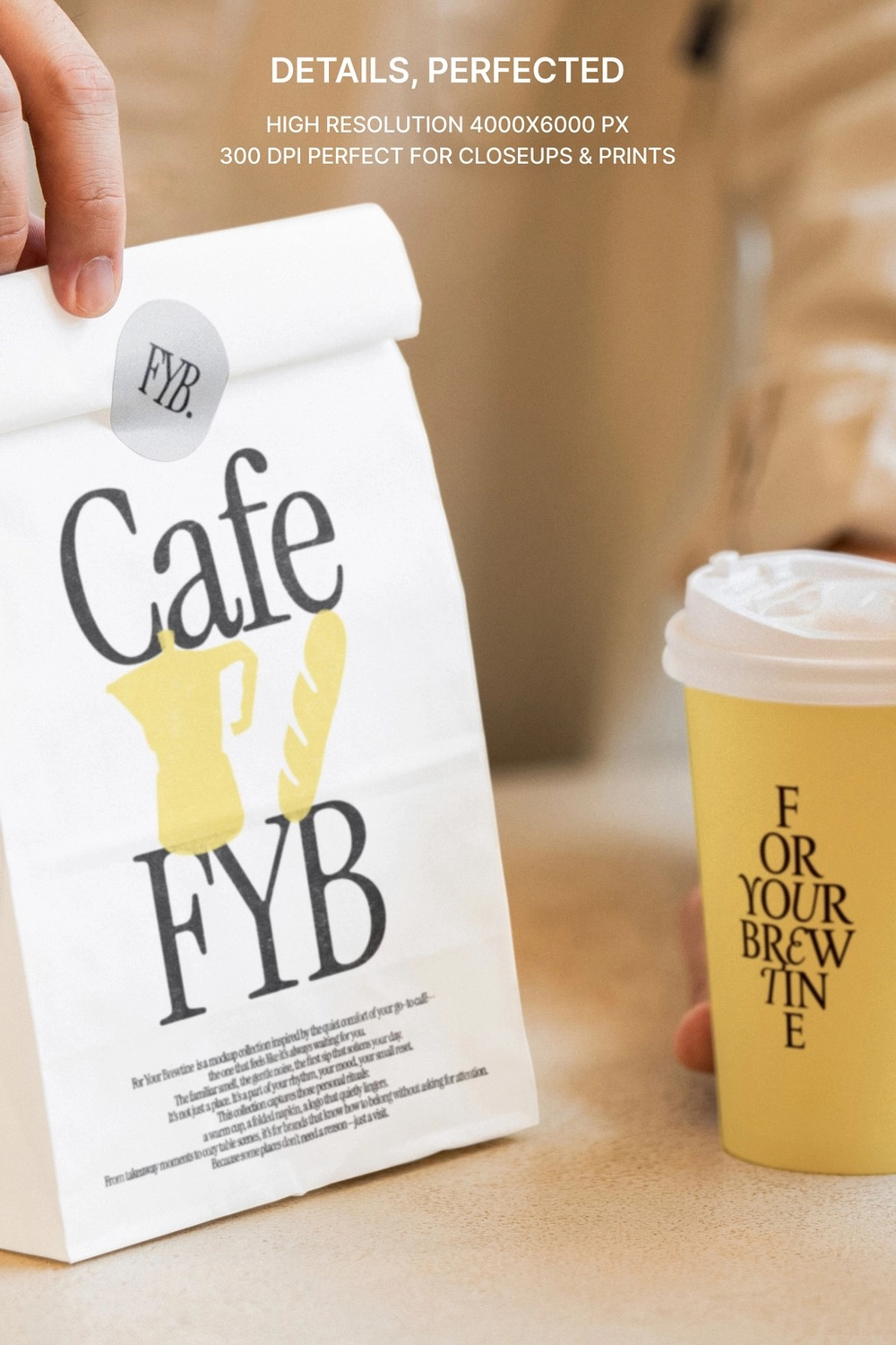 This S#4 FYB Takeaway Bag 02 Mockup is available as a layered PSD file and is easy to customize. You can insert your paper cup design, sticker design and takeaway bag design through the embedded Smart Object and adjust the lid color.